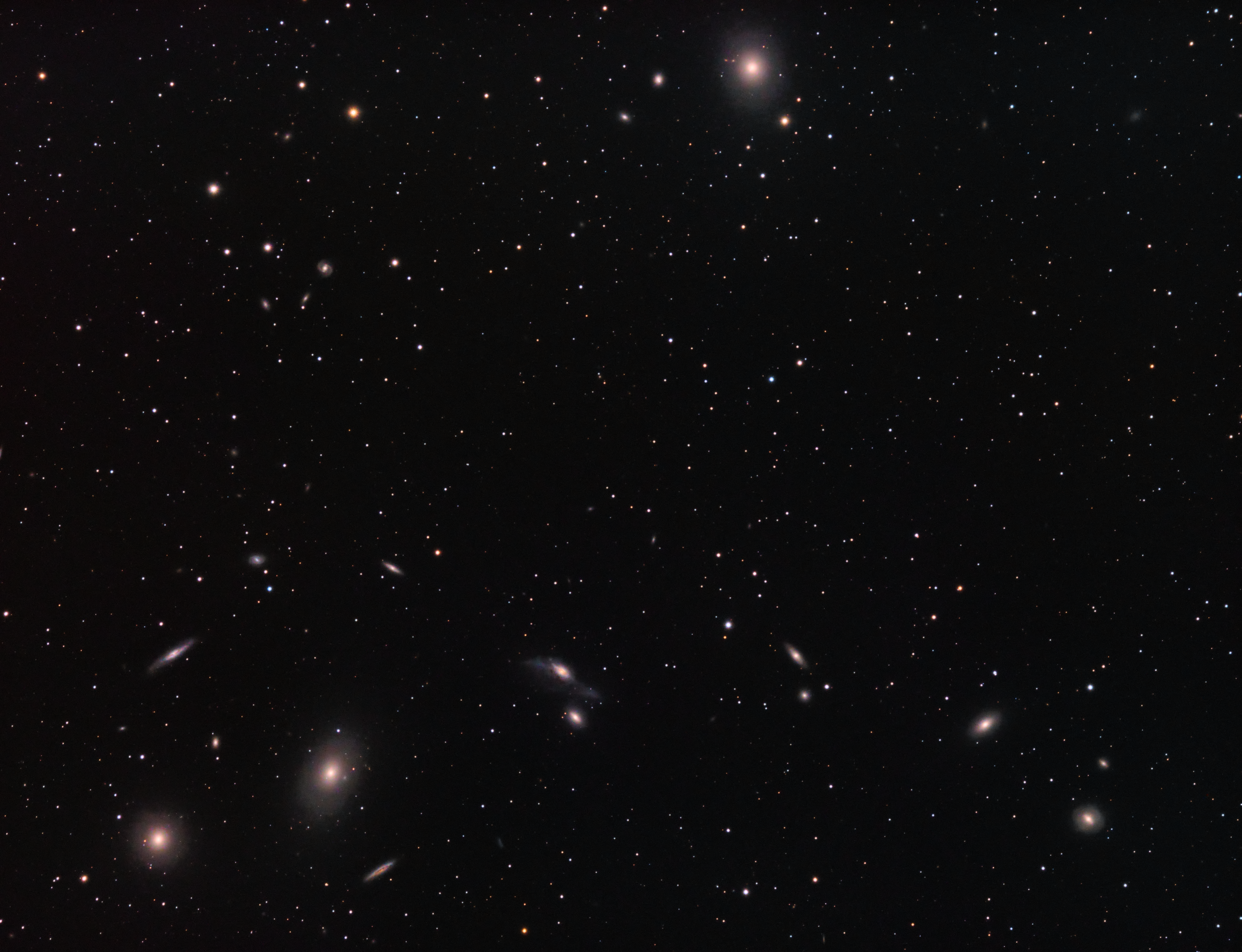 This image included a lot of firsts for me. It was the first image taken with a mono camera and filters. It was the first to use an electronic focuser and rotator. It was the first time I combined data taken over two nights. However, it was not without its challenges. Though it is over two nights, it’s only 2.6 hours of data. Technical glitches limited the first night to an hour of data and the second night to 1.6 hours. On the third night, thanks to the help of a kind soul on the cloudy nights Internet forum I was able to make some major progress on one of my technical issues and collect more than two additional hours of data Even so, at only 4.8 hours there is a lot going on in the frame. These galaxies are on the order of 50-55 million light years away and many of the galaxies are elliptical. Ellipticals never have the kind of detail that spiral galaxies do and the distance hides what there is, but on the spirals in the frame a hint of structure is visible.