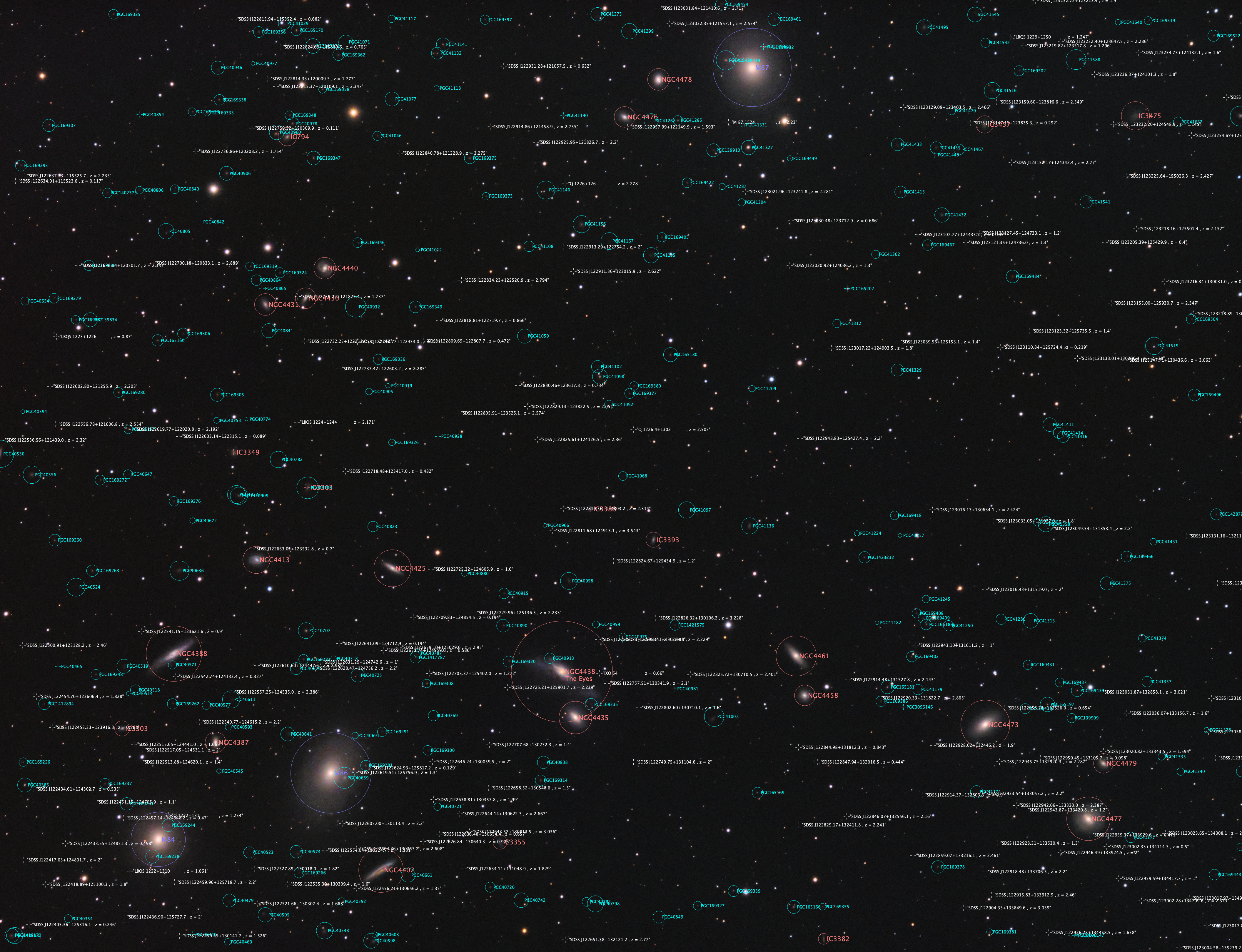 For comparison, the subject galaxies in Markarian’s Chain and M87 are in the range of 50 to 60 million light years distant. While that is incredibly far away it is a tiny fraction of the distance to those quasars, even the closest of them. I haven’t checked all the PGC galaxies but I’ve spot decked a few and they seem to range out to around two billion light years or so.