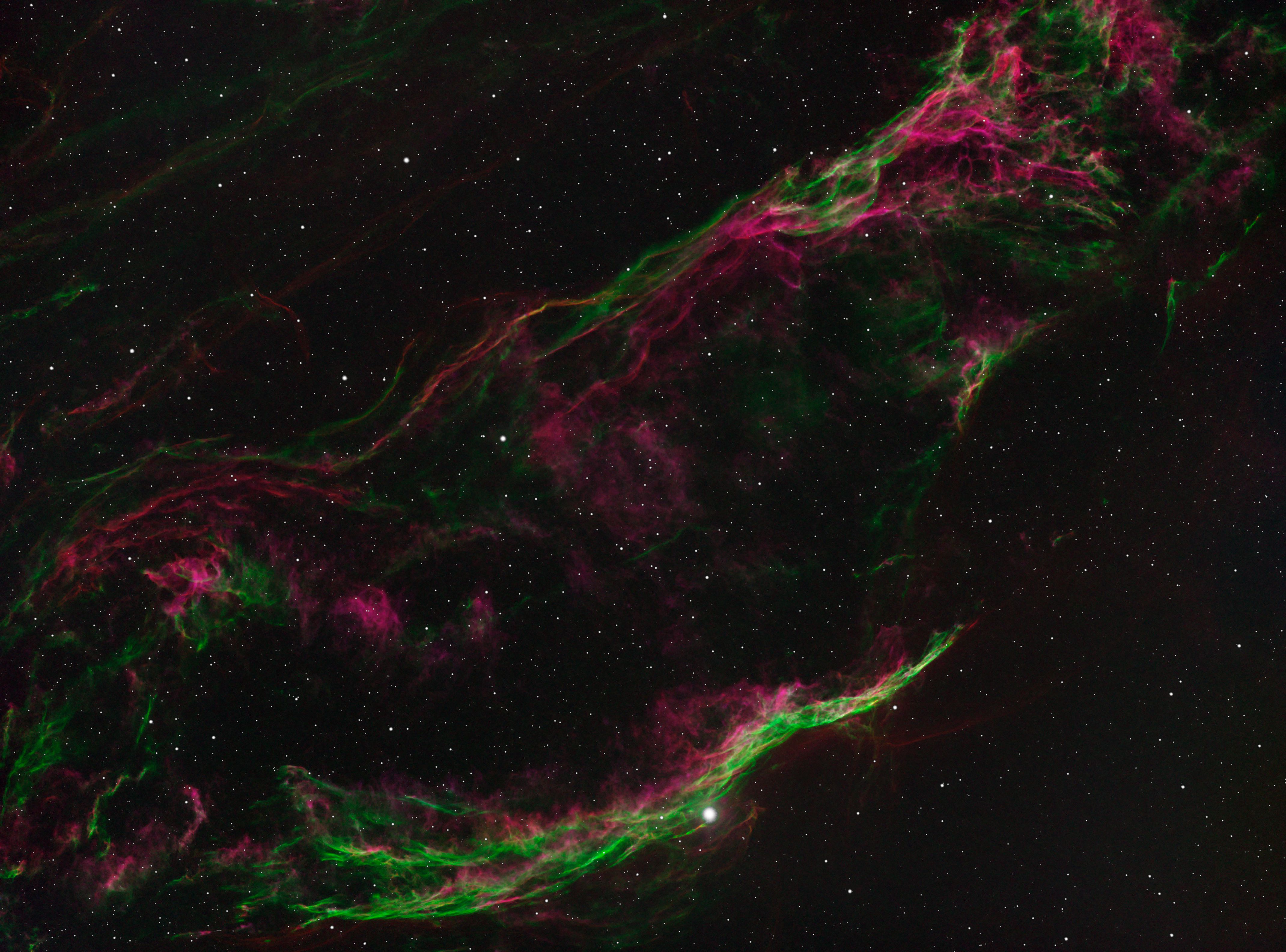 I also rotated this 180 degrees from the earlier version. In the earlier version I felt the Veil was the main subject and the Triangle the supporting actor but in this version, I felt like the red and green wispiness was the star (sorry, pun not intended for once). Pickering’s Triangle drew the eye along into the wispy gas and the Veil provided an anchor to the image. I didn’t like this framing as much on the other image nor the other framing on this image. It surprised me how much the color choices influenced how I felt about the framing.