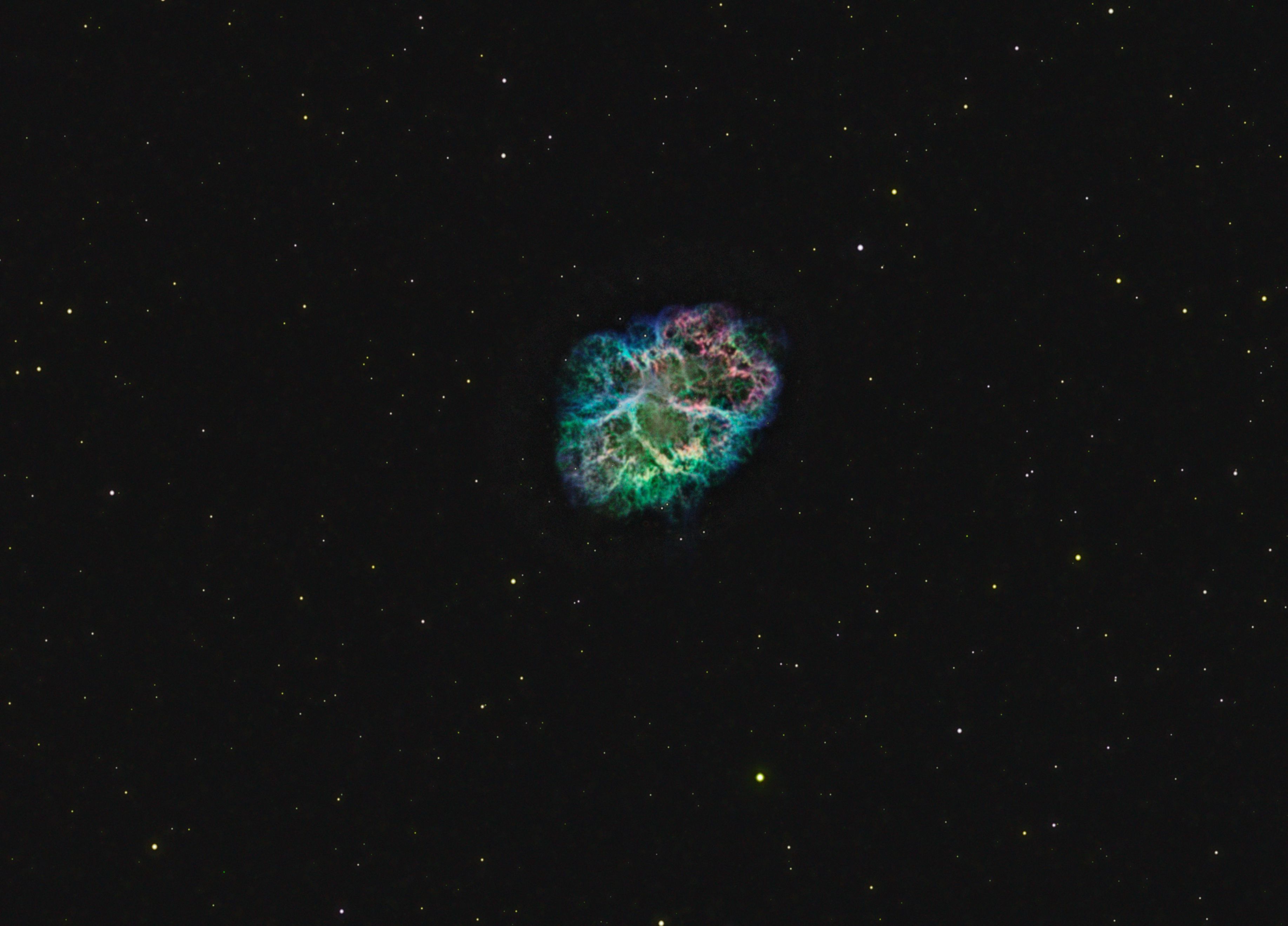 This image is a narrowband image presented in the Hubble Palette, that is the Sulfur II is in the red channel, the hydrogen alpha in the green and oxygen III in the blue channel. The nebula is appears amazingly intricate with tendrils of gas appearing to emanate from a centralist point.