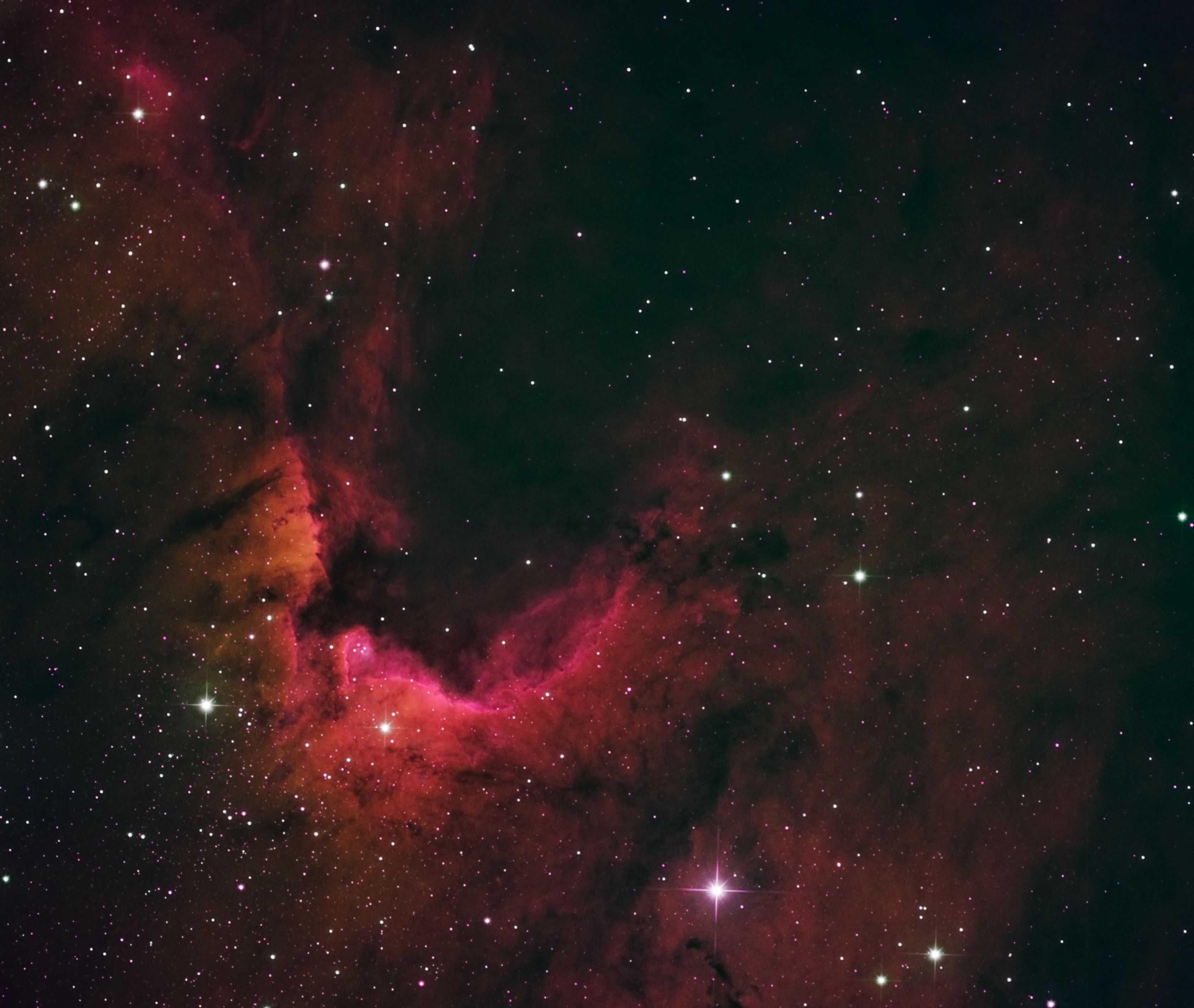 The Cave Nebula, like most astronomical objects has many designations. This one goes by at least three: Caldwell 9, Sharpless 2-155 and LBN 529. It is an emission nebula with significant dust giving it a somewhat unique appearance in the sky.