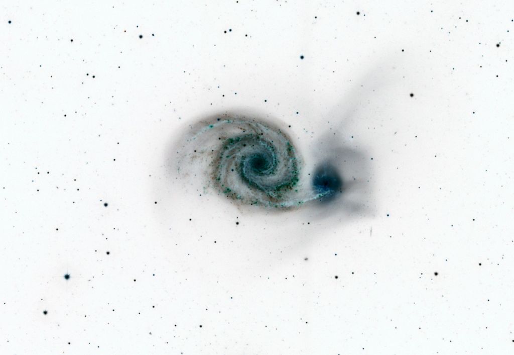 Here is an inverted version of the image. This make it more clear that the arcs of stars below each galaxy actually connect making this interacting system much larger than it might appear at first glance.