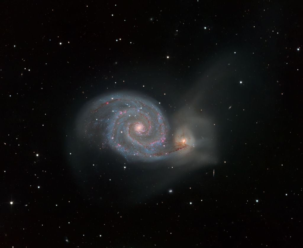 M51, also known as the Whirlpool Galaxy, is another of the best known deep sky objects in the northern hemisphere. It’s one of the best places in the sky to see gravity in action. The tidal stretching of the two galaxies is readily apparent. It’s almost as if we have a still of two dancers caught just before they come together.