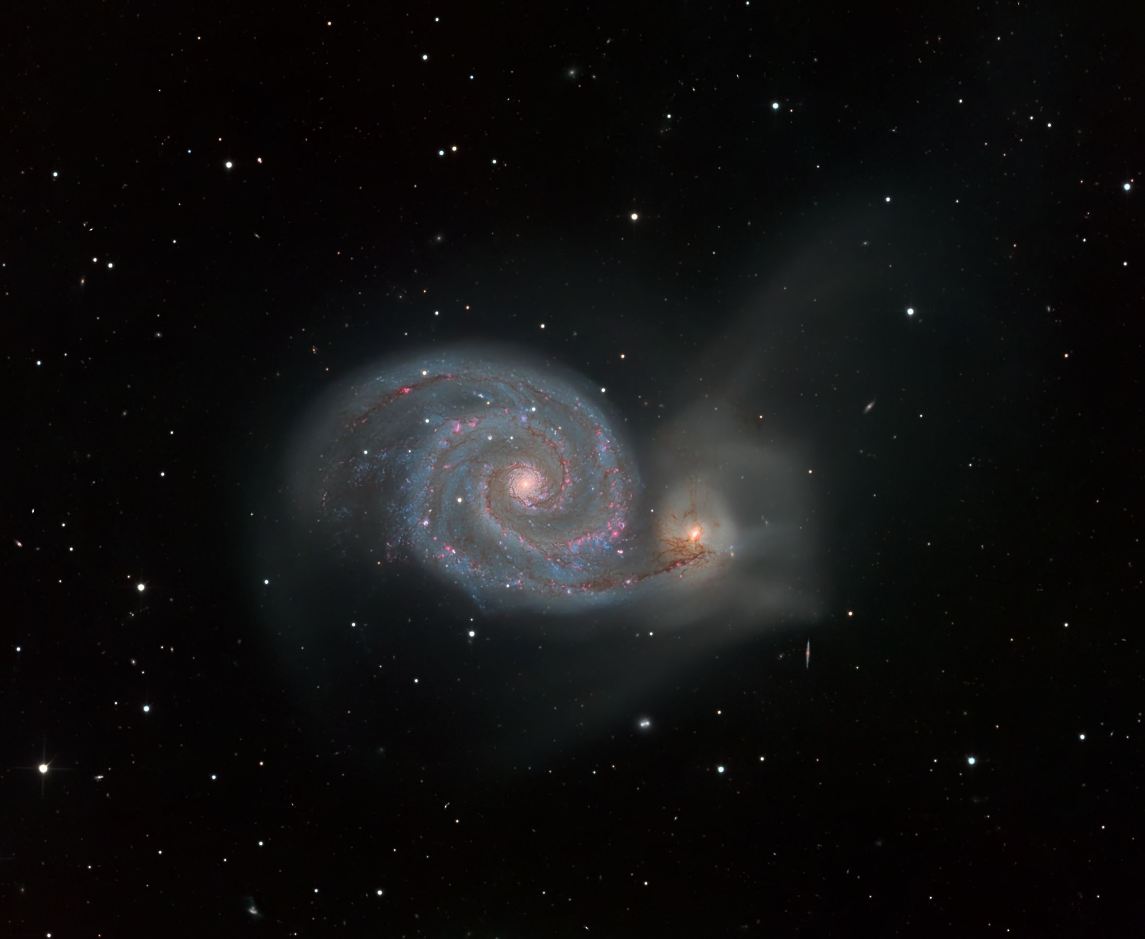 On a less poetic note, this image was taken at SRO on the Planewave CDK14 on which I’m an imaging team member. This is 21 hours, 20 minutes of data collected from late June to mid-July 2021. M51 was starting the night too low to collect much more data this season but that still left us with enough data to make a spectacular image!