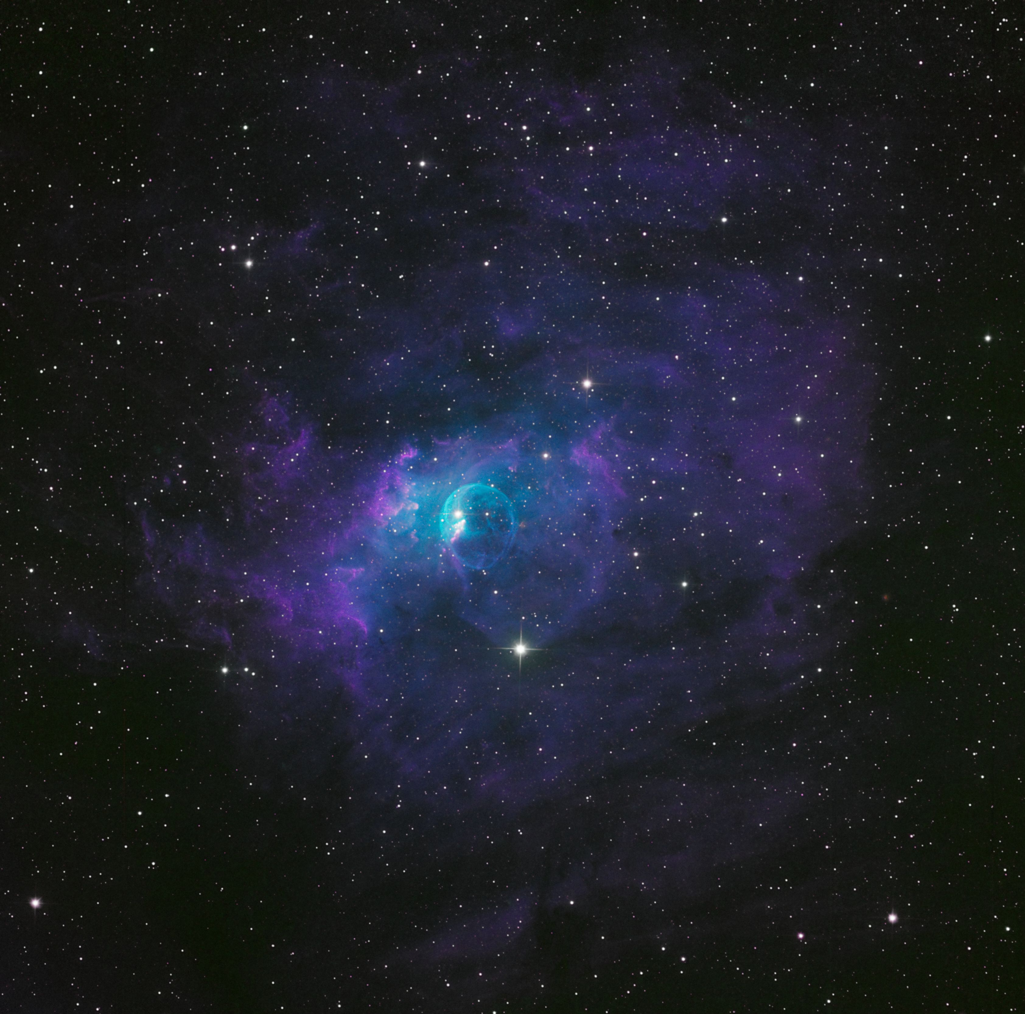 The Bubble Nebula, NGC7635, is an emission nebula in Cassiopeia. The bubble itself is actually a void created by the stellar wind of a hot, young star making it one of t he more distinctive nebulae in the sky.