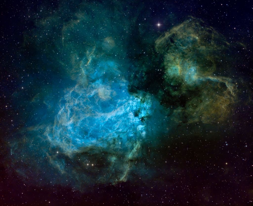 This image is at the top is a reprocessing of the image down below. The original image was an SHO image while this one is the same data but in the HOOSY palette (HOO with S in Yellow).