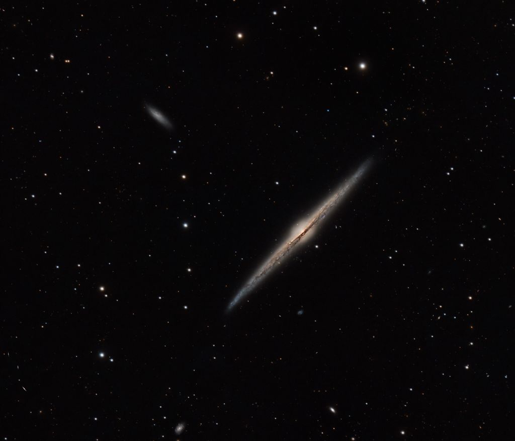 The Needle Galaxy (NGC 4565) is an edge-on spiral galaxy in Coma Berenices. According to Wikipedia it is 30 to 50 million light years away The smaller galaxy to the upper left might be a satellite galaxy or just a more distant background galaxy. It isn’t obvious from the image and the reference material I looked at only mentioned that it had satellite galaxies but not what their catalog numbers were.