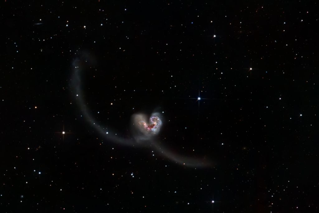 For now we get to enjoy the graceful tidal tail arcs and see the chaos in the main bodies of the galaxies. According to most references these galaxies are about 45 million light years away so it is likely that the light just leaving the galaxies now and due to arrive here in another 45 million years would show us that completed merger.