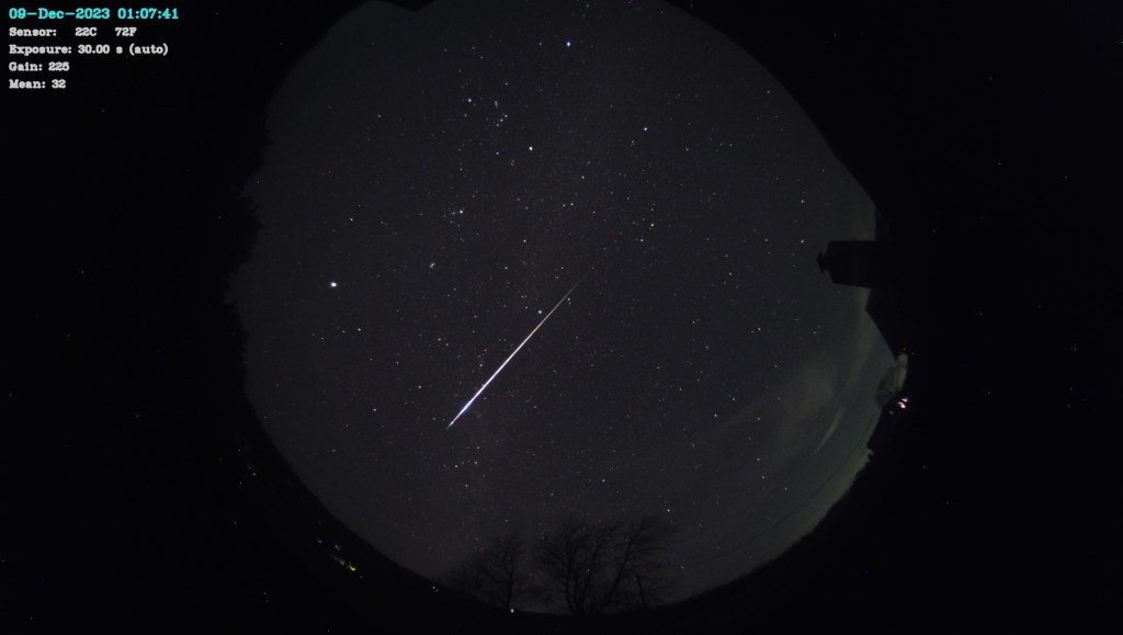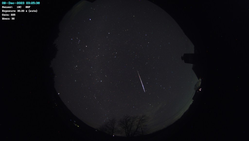I don’t normally see meteors in my alsky camera. They have to be very bright to show up on a camera covering such a large field of view. On the night of December 8th into the morning of the 9th, the camera captured five of them. Two of them must have been pretty bright events, I wish I had been outside and looking up when they came through!