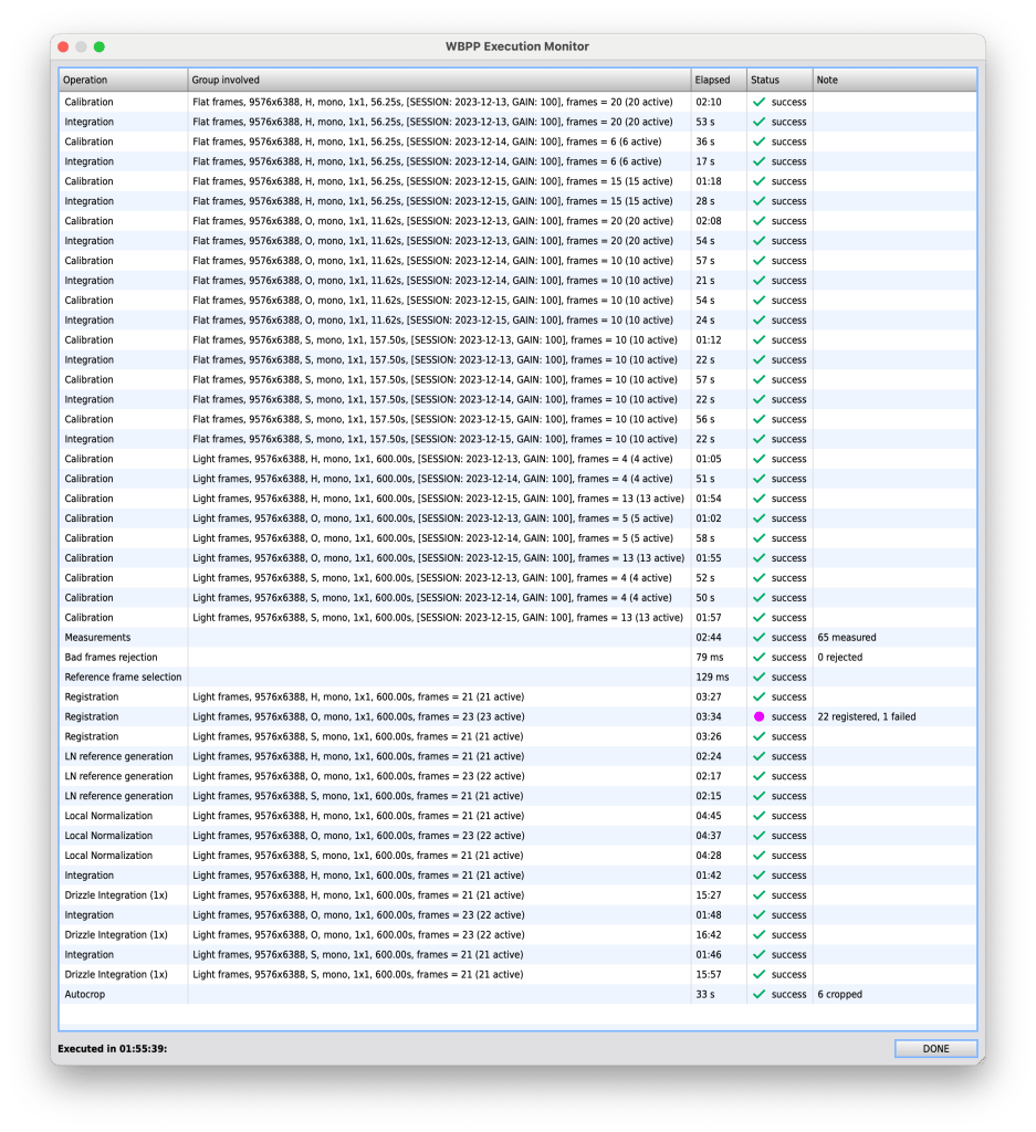 With all that out of the way, how did they compare. For the test, I ran WBPP with a set of data taken at home with the ASI6200MM Pro camera. These are large files. Each file, saved by NINA in compressed XISF format is 77MB. There were three nights of data. Each night had its own flats and there were master darks for the entire data set. WBPP did calibration, cosmetic correction, measurement, bad frame rejection, registration, local normalization, integration and 1x drizzle integration.