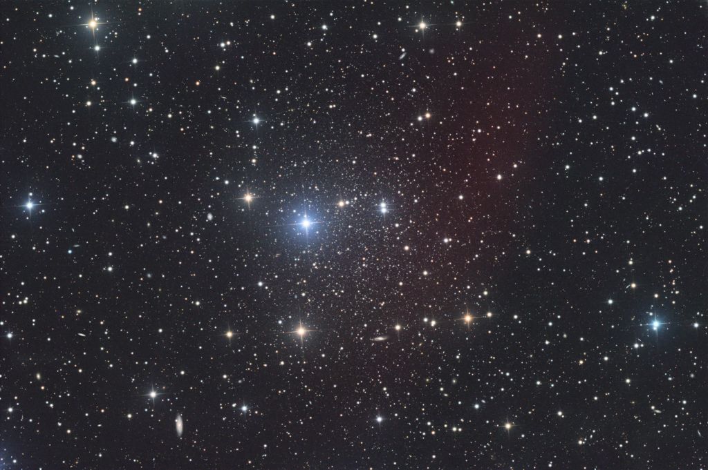 The other mystery in this image is that red “swoosh” just right of center. It’s not from hydrogen-alpha emission. We took four hours of hydrogen alpha data for this and the integration was completely empty of anything except for stars. However, the “swoosh” shows up on some (though not all) red and luminance subs. I’ve looked for it in other images and it doesn’t appear in any that I’ve found. It could be a local light source. I’m ruling out a reflection from a thin high cloud as it’s in the same spot on all the subs even across a few weeks so if it’s a local source it’s somehow in the same orientation to the telescope and that’s something that clouds are unlikely to produce. When I inspect the subexposures, I don’t see anything wrong with them so it’s possible it’s real but just what is could be is a mystery given that it isn’t hydrogen-alpha. If it’s a real emission of some sort then it’s almost certainly in our galaxy (so between us and the Draco Dwarf Galaxy) even though the image gives the impression it’s in the background.