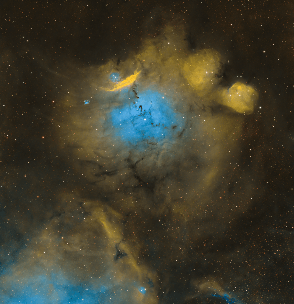 This is an SHO image, also known as the Hubble palette. The idea is to put the data from the three narrowband filters into the red, green and blue color channels in the same wavelength order so S II, being the longest wavelength goes in red, hydrogen alpha being next shortest goes in green leaving O III for blue. This, however, produces an overwhelmingly green image since hydrogen produces a much stronger signal because there is 10 to 100 times more hydrogen than anything else. In this image, I took the common route of simply subtracting the green which leaves a bicolor blue/gold image. The blue is where oxygen is and the yellow/gold is where both sulfur and hydrogen are.