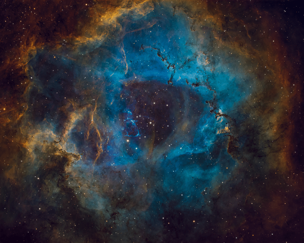 The Rosette Nebula was the first narrowband image I did back in January of 2020. Given the freedom of being able to make the color be whatever I wanted, I went a bit wild. I hadn’t returned to the Rosette but a friend supplied me his data and it was over 100 hours worth, I had to give it a try. On the surface, this seems like overkill given how bright the Rosette is. And, since the Rosette is larger the field of view, we don’t get the benefit on the faint outer edges that a deep integration would provide. Even so, this was very easy data to process. There was plenty of signal in all three masters so there wasn’t a need to try to coerce detail out of the noise.
