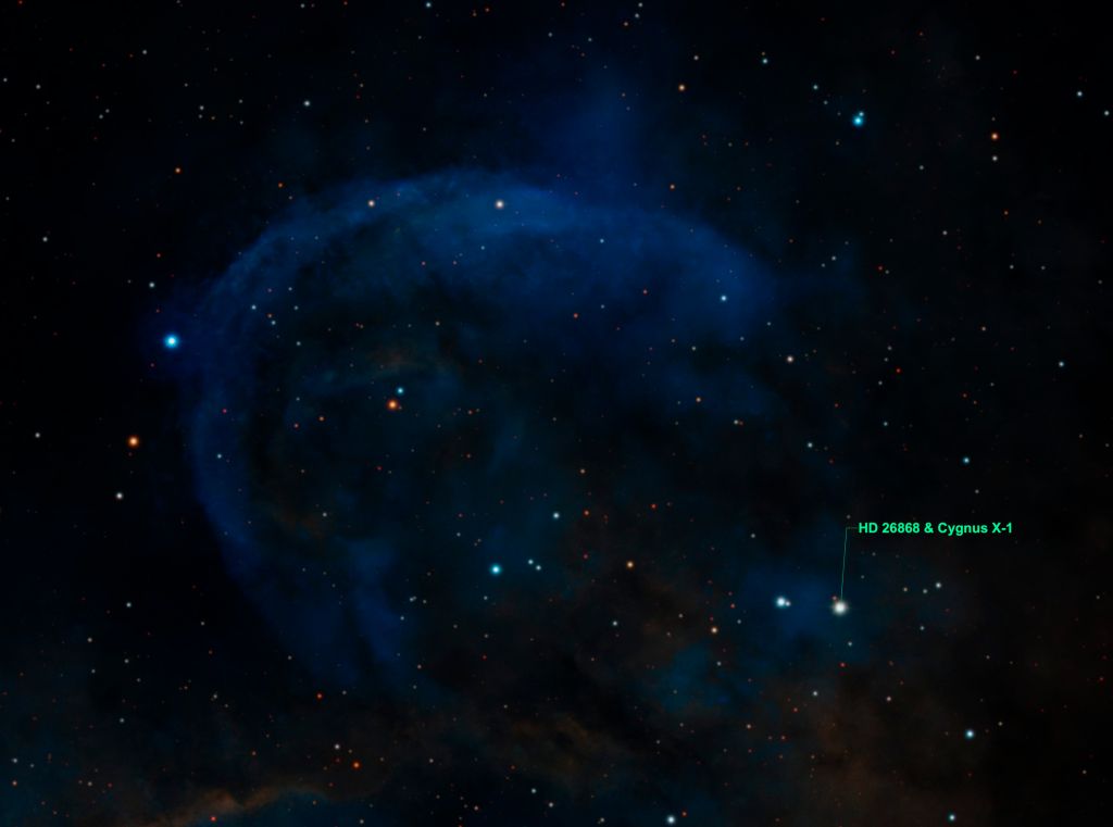 This is a crop of the image above and highlights the star, HD 26868 that is part of the binary pari with Cygnus X=1. The black hole is only about 20% of the distance from its companion star, HD 26868 that the Earth is from the sun