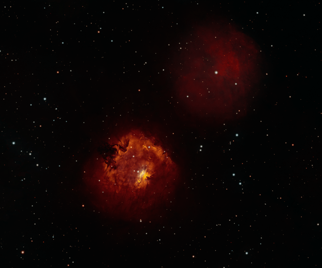 Sh2-168 is the brighter nebula toward the bottom and Sh2-169 is the fainter one to the top right. These are emission nebulae in Cassiopeia. Sh2-168 is around 12,000 light years away but I don’t have reference data form Sh2-169.