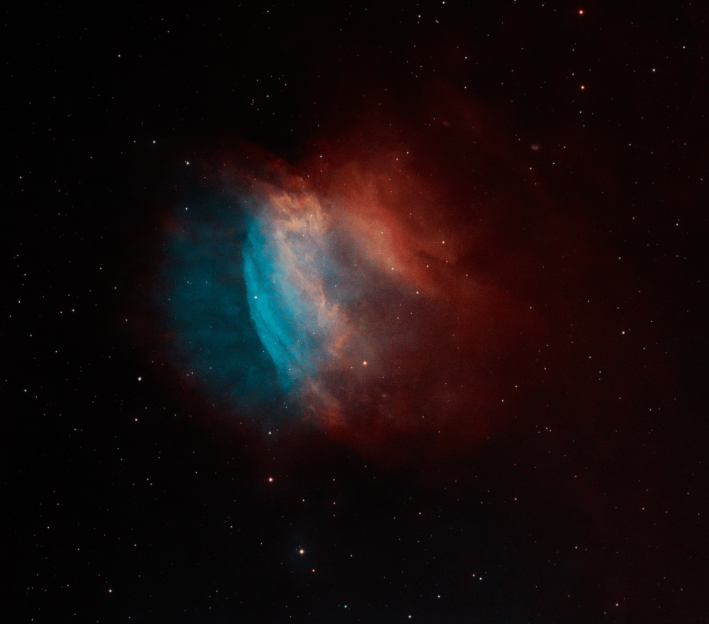 This is a planetary nebula in Cepheus and is about 1,000 light years away. It is less symmetrical than most planetary nebulae. All the oxygen seems to be on one side and most of the hydrogen seems to be on the other. I’m not sure why that is. The nebula actually had a strong signal in the sulfur filter which surprises me. Usually planetary nebulae are strongest in oxygen and hydrogen with little, if any sulfur emission (of course there are other elements but these are the three narrowband filters most amateurs use).