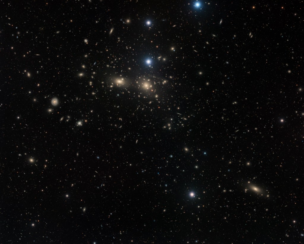 There are over 1,000 galaxies in the cluster and the mean distance of the cluster is 321 million light years. Two of the largest (both in the image and in an absolute sense) are NGC 4784 and NGC 4889. These are supergiant elliptical galaxies, much, much larger than our own Milky Way spiral galaxy. NGC 4889 is also cataloged as Caldwell 35.