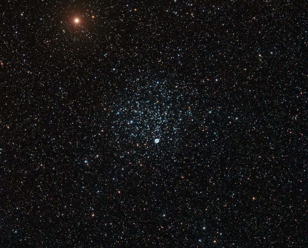 Although the planetary nebula appears to be within the cluster, their radial velocities are different so they aren’t related. That is to say, the nebula didn’t come from a star within the cluster. The nebula is about 1,370 light years away and the cluster has an average distance of 5,000 light years sot he nebula is most likely passing in front of the cluster relative to us.